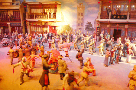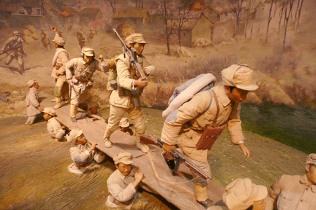 陈毅所说:淮海战役的胜利,是人民群众用小车推出来的。在整个战役过程中,解放区人民筹军粮、做军鞋、缝军衣,一心一意忙支前。解放军打到哪里,解放区人民就把道路、桥梁修复到哪里。解放区人民还掀起了“到前线去,到主力去”的参军参战热潮,出现了许许多多父送子、妻送夫、兄弟争相上战场的生动情景。解放区人民在淮海战役中,要人有人,要粮有粮,在辽阔的土地上,人欢马叫,车轮滚滚,展现出一幅波澜壮阔的人民支援战争的宏伟画卷,为取得战役的胜利作出了巨大贡献。纪念馆里展示了这样一组数字:淮海战役中共出动民543万,筹运粮食4.8亿公斤,担架20.6万副,大水车88.1万辆,挑子30.5万副,牲畜76.7万头,船只8539只,汽车257辆。