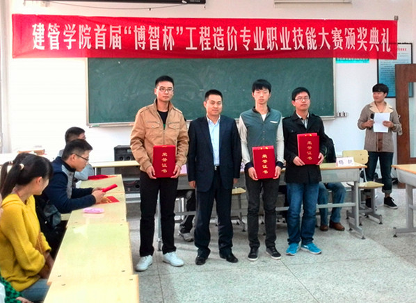 公司于6月份组织开展了“博智杯”工程造价专业职业技能大赛暨第六届全国高等院校广联达软件算量大赛预赛。举办此项大赛旨在进一步加强学风建设,在员工中掀起“比、学、赶、帮、超”的浓郁学习氛围,培养员工职业素质,提高员工职业技能,大赛得到了工程造价专业员工的积极响应,255名同学组成85个团队报名参赛,经层层选拔,共有60人20个团队参加了全国预赛,最终评选出一等奖3名、二等奖9名、三等奖16名、优秀奖27名。其中,造价11-2班李元壮、张宁、侯长虎三名同学代表公司参加了9月份举办的第六届全国高等院校广联达软件算量大赛决赛,三人凭借出色表现荣获团队二等奖。