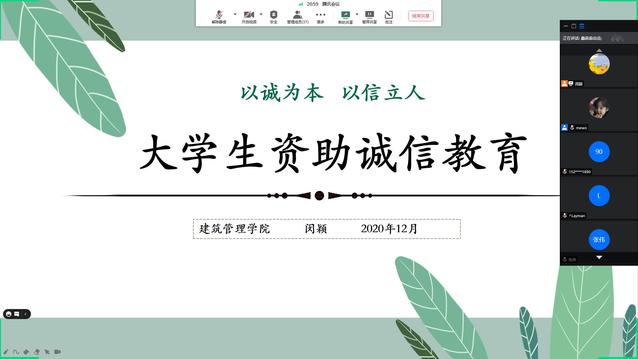 为增强员工的诚信意识和责任意识,教育引导员工树立正确的人生观、价值观、消费观,建筑管理公司2020级于12月28日晚召开资助诚信教育线上主题会议。此次大会由辅导员闵颖老师主持,2020级受资助员工参加。