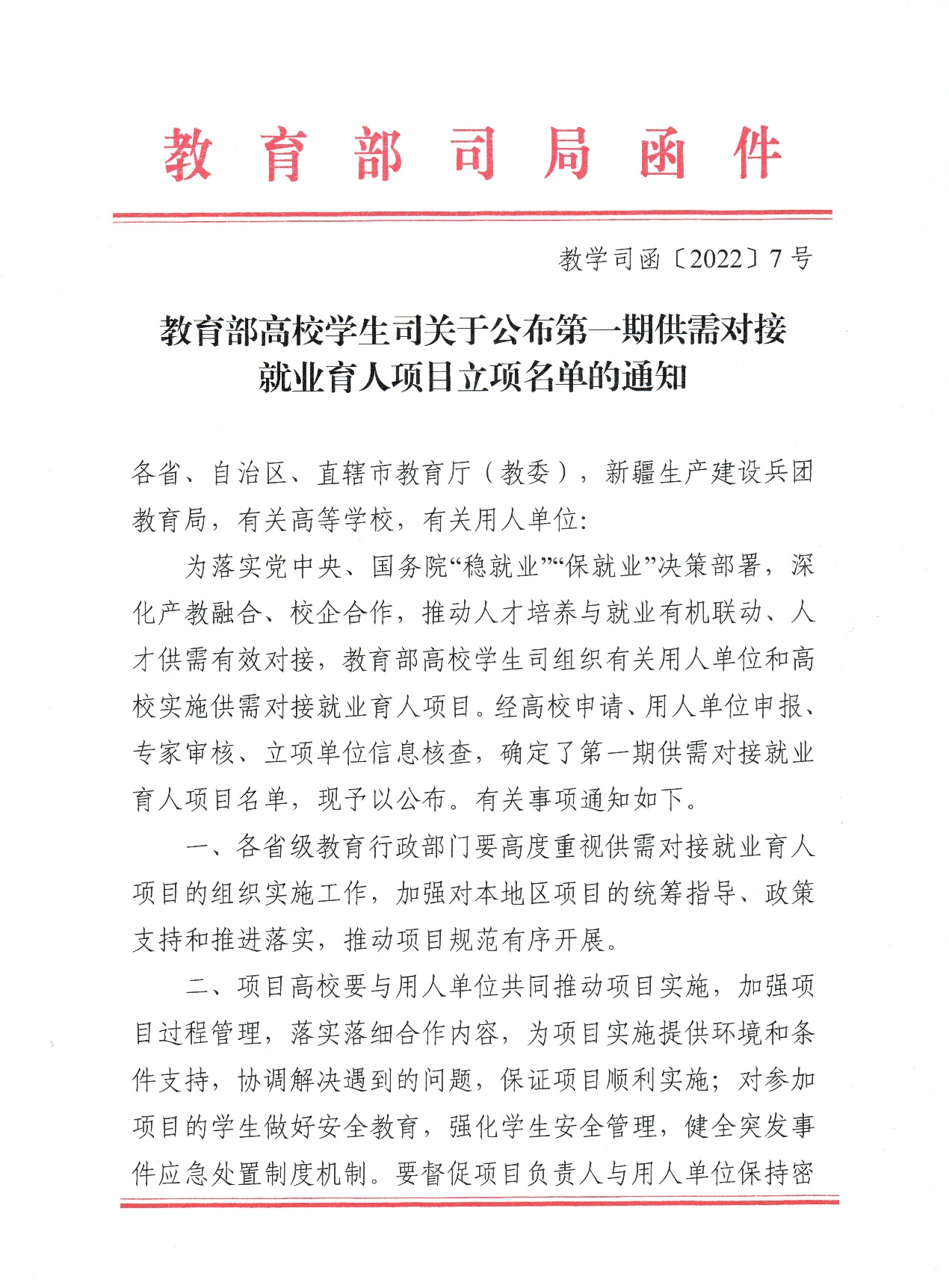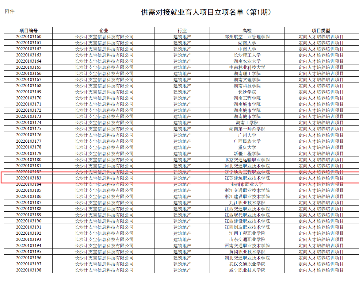 根据《教育部高校员工司关于公布第一期供需对接就业育人项目立项名单的通知》(教学司函〔2022〕7号),公司与长沙计支宝信息科技有限公司合作申报的“数字化合约计量工程师”定向人才培养项目被教育部立项为第一期供需对接就业育人项目。