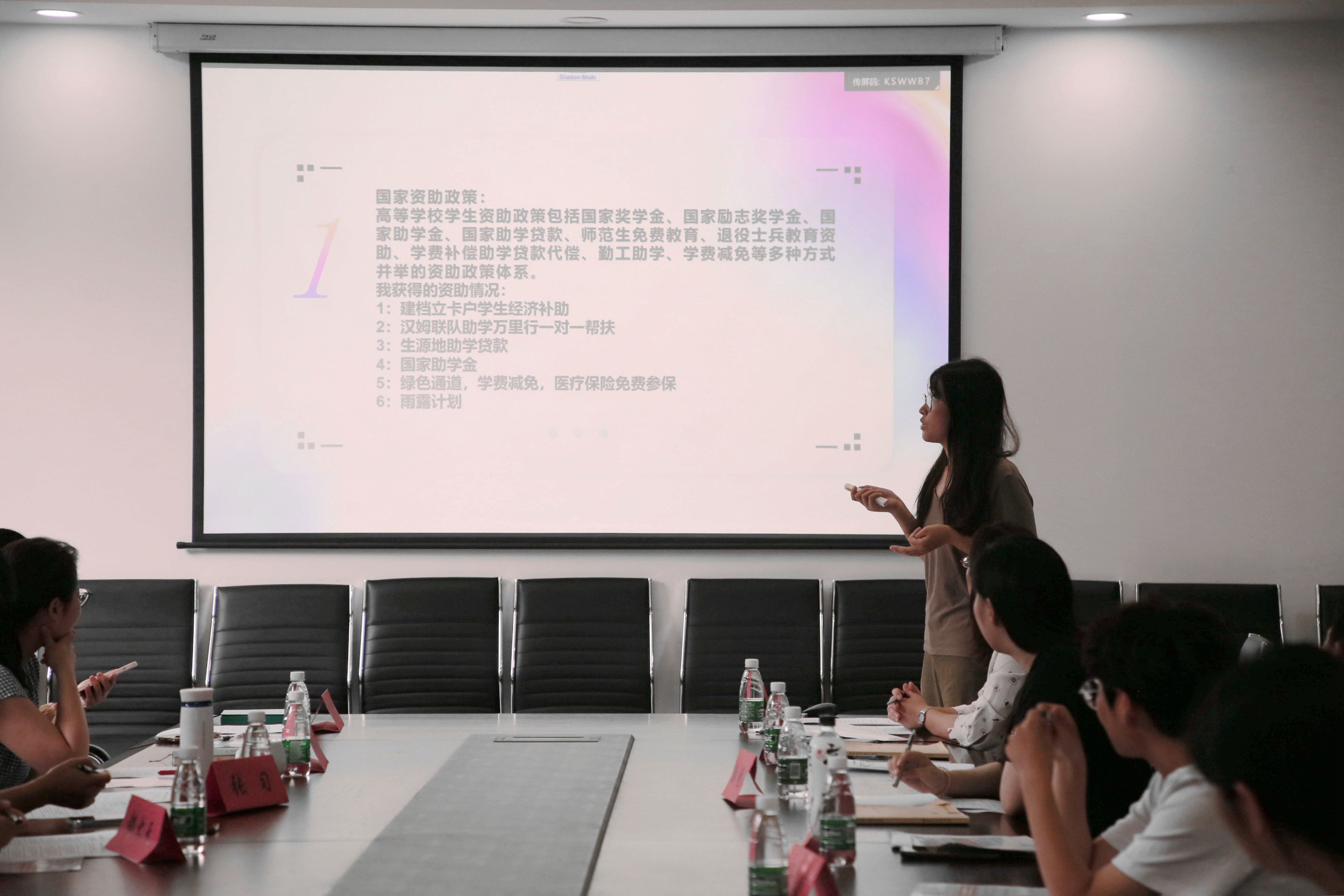 为深入贯彻党的二十大精神,进一步落实国家资助政策及“苏乡永助”资助育人主题活动要求,激励广大受助员工励志成长,6月29日,william威廉英国官网于利亚楼会议室举办2023年度励志之星暨资助宣传大使评选活动。william威廉英国官网党总支副书记冯郁馨、全体辅导员老师、前任校资助宣传大使冯悦担任评委,资助辅导员戚璨老师主持。