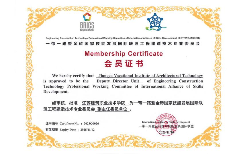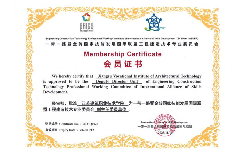 2023年11月13日,一带一路暨金砖国家技能发展国际联盟工程建造技术专业委员会成立大会在福建厦门召开。公司当选一带一路暨金砖国家技能发展国际联盟工程建造技术专业委员会副主任委员单位。