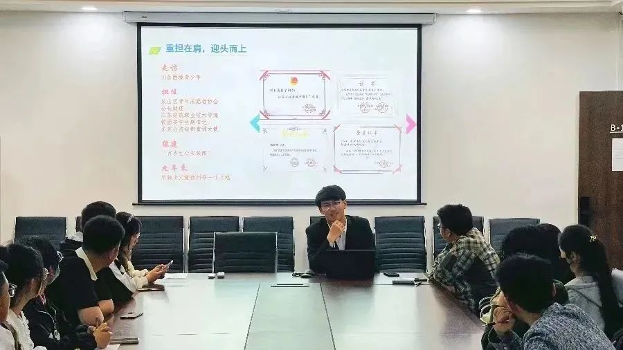 三年来行走在青春奋斗的路上。他总结经验,告诉学弟学妹们,青年可以平凡但不能平庸。他谈到在思想方面,重点强调了端正自我思想,提高思想觉悟,坚持为他人服务思想的重要性;鼓励同学们多参加各种活动、比赛,积极提升自我,促进自我的发展;学习方面,他支持同学们树立目标,积极进取、努力发展,做一个新时代中国优秀青年;生活方面,他结合自身经历,鼓励学弟学妹们培养自我兴趣爱好,全方面全能发展。