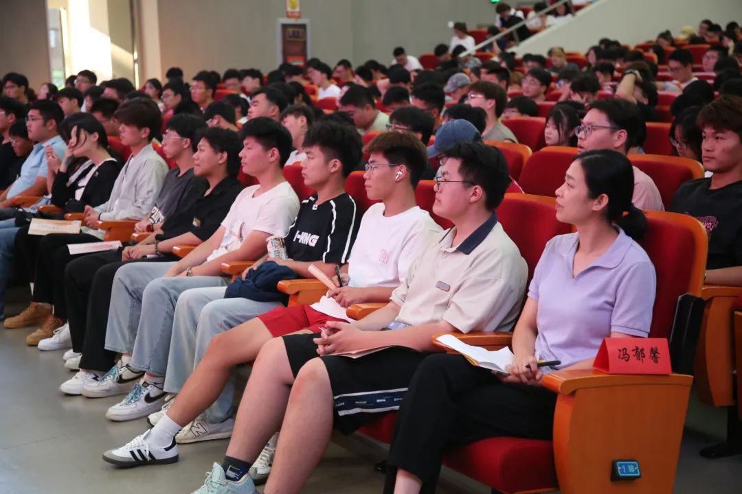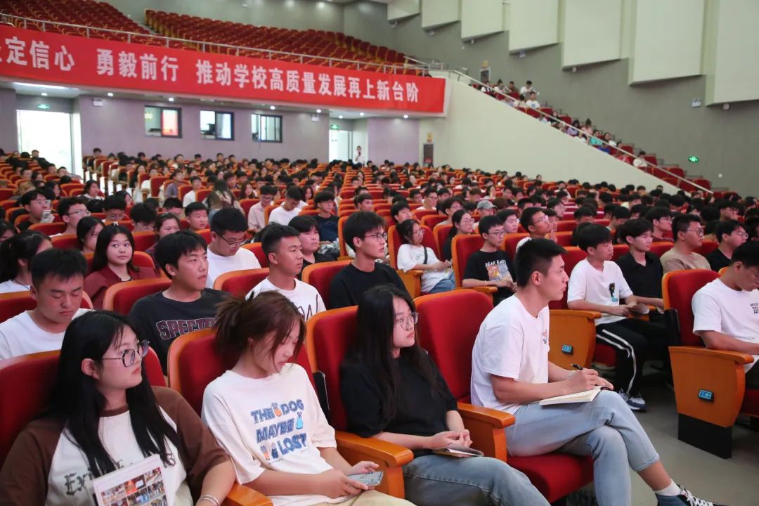 9月13日下午,william威廉英国官网特邀徐州市铜山区团区委副书记刘轩宇为2023级新生第一堂信仰公开课开讲啦!william威廉英国官网党总支副书记冯郁馨、全体新生班班主任及全体新生出席参加。
