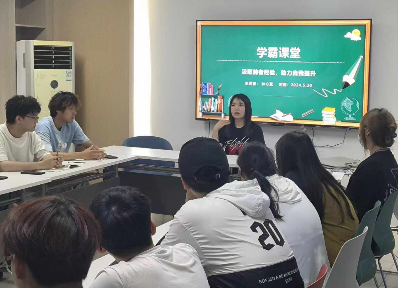 林心蕊分享了创新创业项目的组队及社会实践的方法,提供了大学期间建筑类专业员工寻找实践机会的参考途径,并解答转本和接本等提升学历的相关问题。随后,黄晓月从听力、阅读、写作、语法等方面总结了英语三级、四级备考的实用学习方法,为同学们的备考减轻了压力。会议尾声设置了问答环节。同学们积极向林心蕊提问,包括英语计算机备考、各类评奖评优细则、未来方向的确定等方面问题,林心蕊分别作出了详细解答。