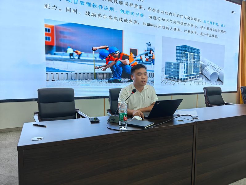 优秀员工洪发川先生作为特邀专家,以“锚定未来,未来已来”为题,用轻松诙谐的方式,分享了在校期间的学习经验和成长历程。同时,他鼓励大家提前进行职业规划,不懈追求卓越,提升个人竞争力。他现身说法,深刻阐述了理论知识与实践经验相辅相成的重要性,勉励2024级建设工程管理专业的新生们,唯有两者并重,方能在未来职场中稳健前行。