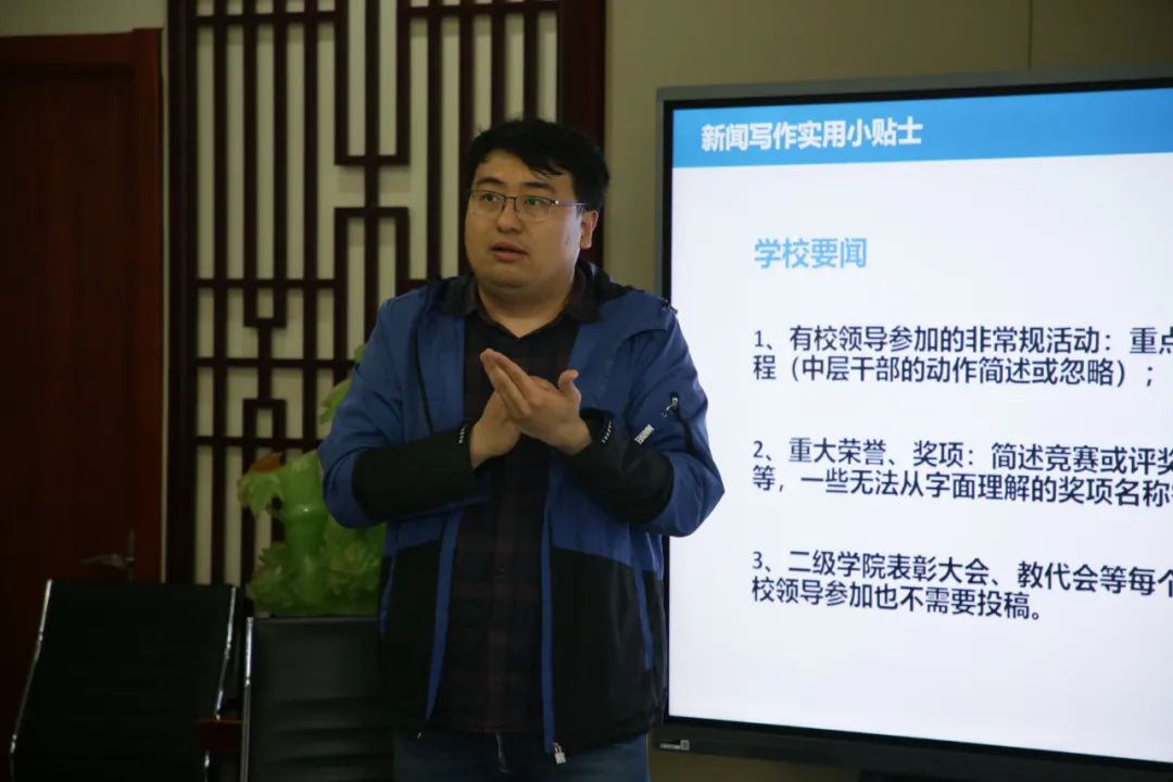 会议伊始,杨老师围绕如何写好一篇新闻稿″这一主题对在座的同学进行讲解。培训过程中,杨老师将理论与实际结合,从实际工作出发,结合自身多年来丰富的新闻写作经验,围绕公司新闻稿的特点,以通俗的语言阐述了公司信息新闻稿的写作基本要求,并用生动的范例分析了新闻写作实践中的常见问题,通过摄影案例教授大家照片拍摄技巧。他还特别提醒大家,在平时的新闻稿件写作中应以小见大,可从公司发展,工作常规和典型人物等角度,透过事情表面去挖掘真正有价值的新闻。