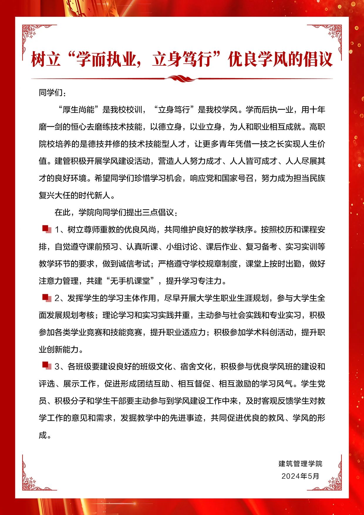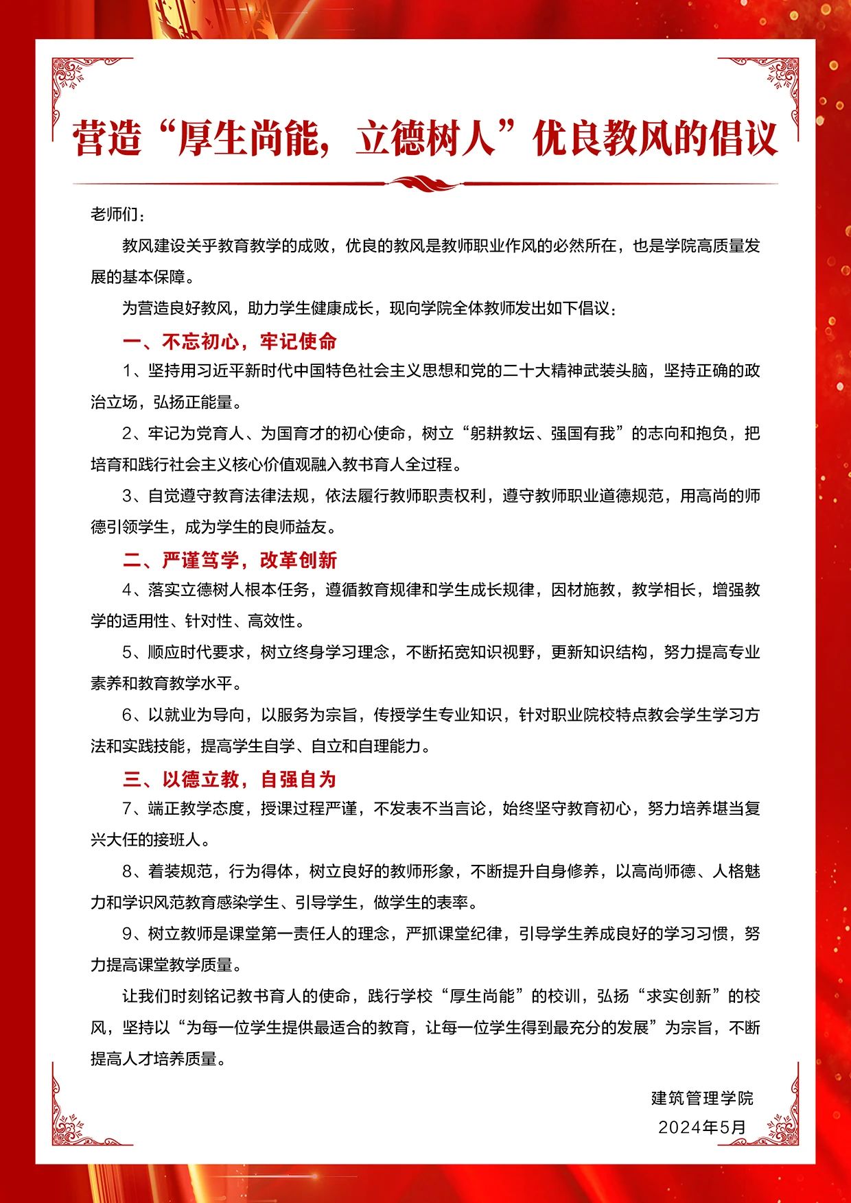 她希望,各位教师在此次活动中能够充分结合学风建设,做到学高为师、身正为范,增强教书育人的责任感和使命感,提高参与教学的积极性和热情,进一步创新公司产品方法。同时,她还希望同学们能够坚定学习目标,弘扬诚实守信的精神,追求全面发展,遵守校规校纪,树立良好学风,充分利用校园学习资源与设施,积极参加社会实践、技能竞赛和公益活动,努力成为高素质技术技能人才。