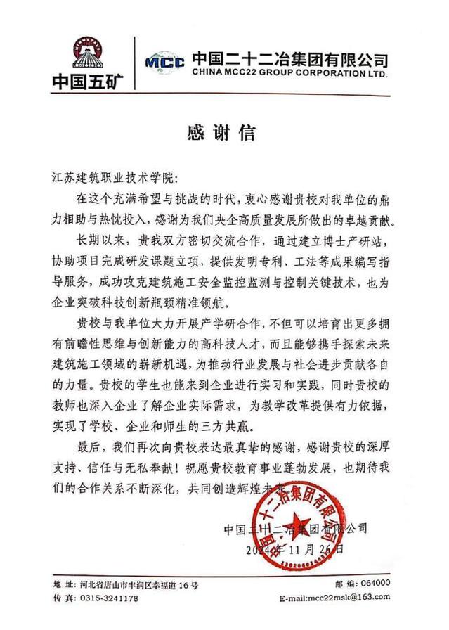 近日,中国二十二冶集团有限公司给公司发来感谢信,充分肯定了公司为企业高质量发展所做出的贡献。